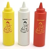 Mayo, Mustard and Ketchup are staples at every barbecue and picnic.Take them to the table with the Charcoal Companion Classic Diner Condiment Bottle Set.Set of three 16-ounce bottles with twist-top caps, one each for Mayo (white), Mustard (yellow) and Ketchup (red).Look for coordinating tablecloth weights sold separately.