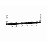 Professional chefs know that well-planned kitchens require immediate, unencumbered access to pots, pans, and other cooking essentials in order to function properly. Crafted of solid Asian hardwood, this handsome hanging rack offers a sleek, distinguished way to display fine cookware with both style and convenience. Four pan hooks and two swivel hooks--each constructed of sturdy cast aluminum--suspend between its dual-track system, making it possible to slide or swivel them into countless positions for a customized rack suited to any cookware collection. Even more, the unit provides two rugged connecting bolts for resilient installation, as well as 16 hanging links that can be adjusted to create the proper hanging height from any ceiling (hangs 23 inches low with standard number of links used). Best of all, the rack features a beautiful finish that blends attractively with existing decor and hardware to ensure a flawless introduction into any kitchen. A wonderful supplement to cupboard and drawer space, the hanging pot rack measures approximately 2-1/2 by 36 by 2-1/5 inches.