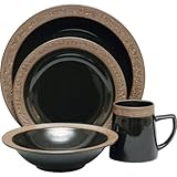 Rustic charcoal is a casual look with rich glaze in the plate, and a soft embossment of the rim in contrasting brown. Set consists of 4-each: dinners (10-1/2-inch, salad (7-1/2-inch), soup (7-1/2-inch), mug 12-ounce. Microwave and dishwasher safe. Meets or exceeds all federal and state requirements.