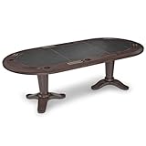 Designed to accommodate eight players with sufficient elbow room to play comfortably, this oval, 47-inch x 94-inch hardwood hold-'em table with distressed-walnut finish features a charcoal-colored leather surface. Each player position has a chip well and a cup holder. Two sturdy three-footed pedestal bases ensure stability and contribute to the table's heirloom-quality construction and design.